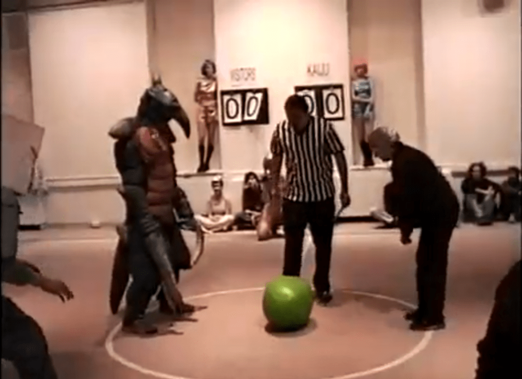 Now-infamous soccer match of Kaiju vs. art students & faculty. Who can win when Pole Cato eats the ball? Halloween 1997, School of the Museum of Fine Arts, Boston, MA