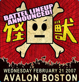 Before the opening ceremony had even begun, Kaiju’s historical TV pilot was interrupted by the Space Pirate Giii. He caused quite a ruckus until the Hero-In-Training stepped in to pacify the intergalactic swashbuckler. It took more than a H.I.T. to subdue Giii and fortunately, Neo Teppen and Tadd Bradley were on deck to save the day. In Battel 2, the Apes of Wrath grappled with the Sea Amigos for the Double Danger Tag Team belts. Both D.W.C. III and Hell Monkey fought each other for a belt and ultimately, it was the jungle that beat the ocean in this fight. The results of Battel 3 found Powa Ranjuru readily defeating a zombie Pablo Plantain and Dr. Cube’s wicked henchman, the Silver Potato. Battel 4 was less of a “battel” and more of a wild dance soiree. Super Wrong entered the wring with a gang of backup dancers, 3-2-1 Party! and even confetti cannons. But it wasn’t enough to fend off the strength of Dusto Bunny who, in due course, stuffed Super Wrong in the Mocky Tomb of Doom. Dusto didn’t take the victory too seriously though, and in the positive spirit of the Battel activities, danced off with Super Wrong into the night! Finally, Kung-Fu Chicken Noodle clashed against the baddest guy of them all, Dr. Cube. Seeking revenge on Uchu Chu who was earlier mauled by a pair of towering Super Minions, the Swarm unleashed an insectoid attack on both the Cube and the Can. But leave it to the Cube and the Can to team up with all their might to exterminate the creepy crawlers. This team clearly wasn’t going to stick together for very long and after two back-to-back five-fingered chowder fists, Soup picked up the Championship belt and the baby Sky Deviler, leaving Dr. Cube defeated and dejected. February 21, 2007, Avalon, Boston, MA