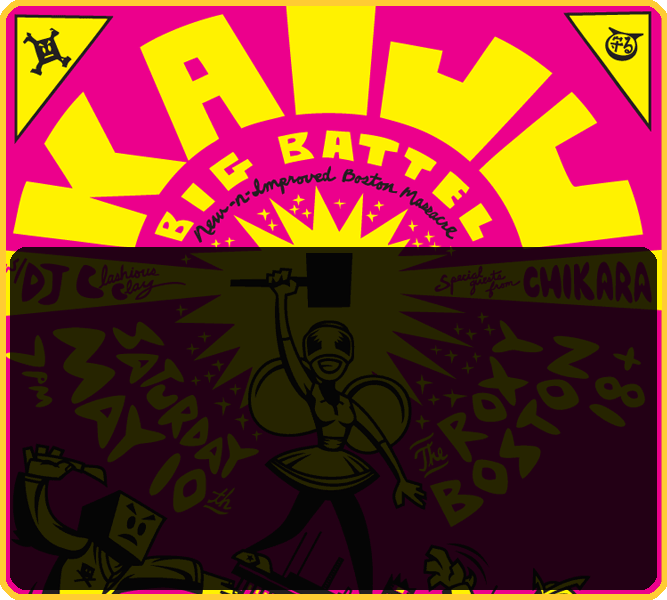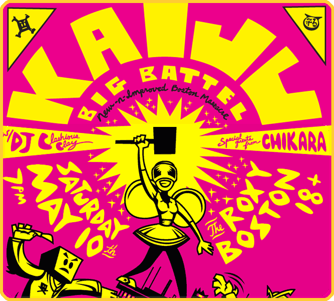 After recent New York and Providence Battels, Kaiju returned home on May 10th, 2008 for the New & Improved Boston Massacre. Saturday night proved to be alright for fighto, as fans were treated to an evening of attempted rabbit mutilation, electric guitar hot-potato, time-travel, water balloon violence, and more monster mayhem than you can shake an ice cream cone at.