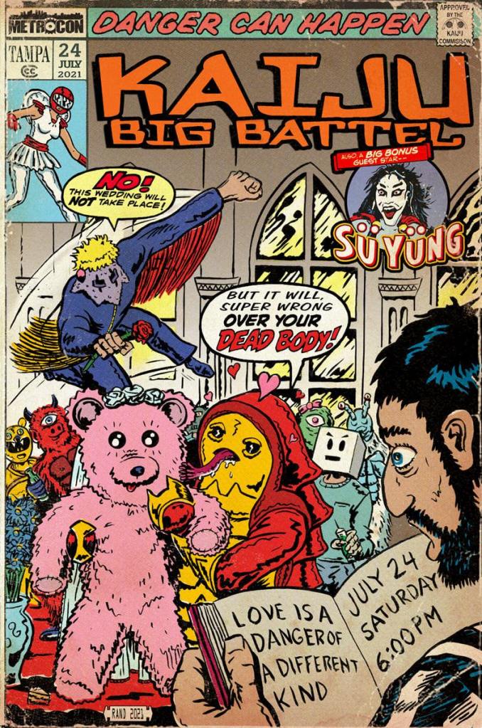 Kaiju Big Battel’s first full show in over a year was a packed success in sunny Tampa, FL at Metrocon 2021. The love connection between Hunninaught and Jeremiah the Pink Bear was made official with a huge Kaiju destination wedding. Matches decided the wedding party and who got to throw the bouquet. Rowdy guests were ejected with extreme prejudice.