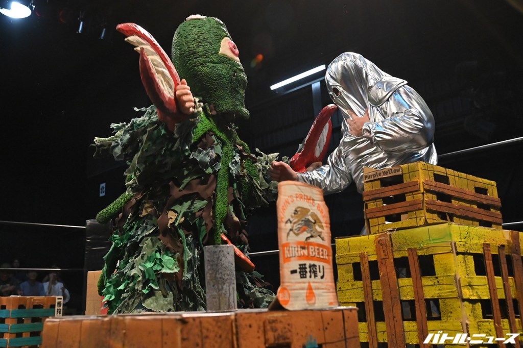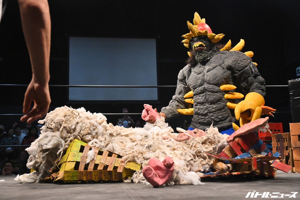 Cycloptomus lifted the Tokyo Tower and tried to throw it at Potato, but Potato intercepted with a gut shot and caught the Tokyo Tower. However, when Cycloptomus ran in, the tip of the Tokyo Tower pierced his torso, and Potato slammed the Tokyo Tower into the top of Cycloptomus’s head, knocking him unconscious. Potato placed as many giant buildings as he could on top of Cycloptomus and dropped a 630° Senton for the pin. This got the three count.