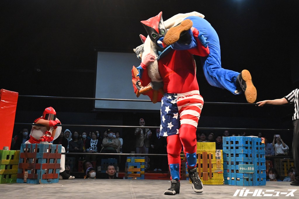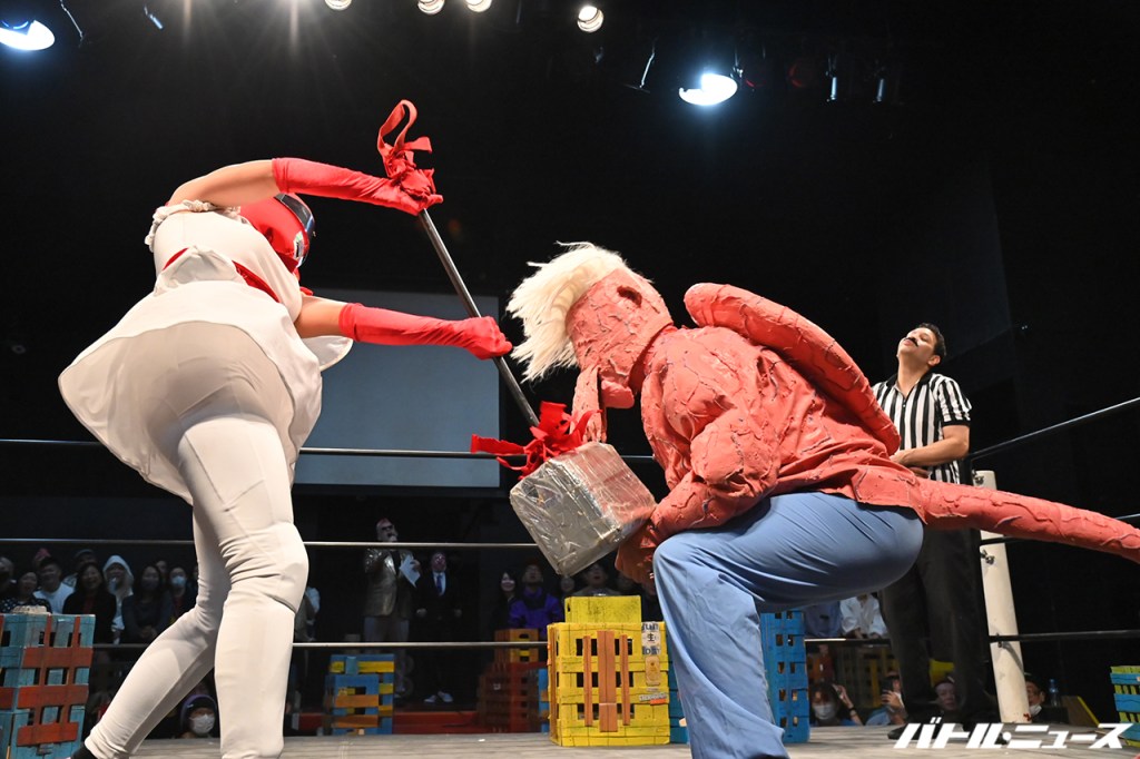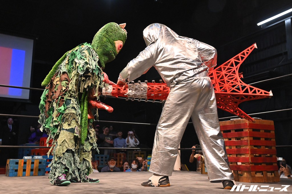 An English ring announcer and a mysterious Japanese masked man appeared on the TOKYO monument towering over the Shinkiba ring. They excited the crowd, but Cycloptopus and Silver Potato burst in and the fight began.
