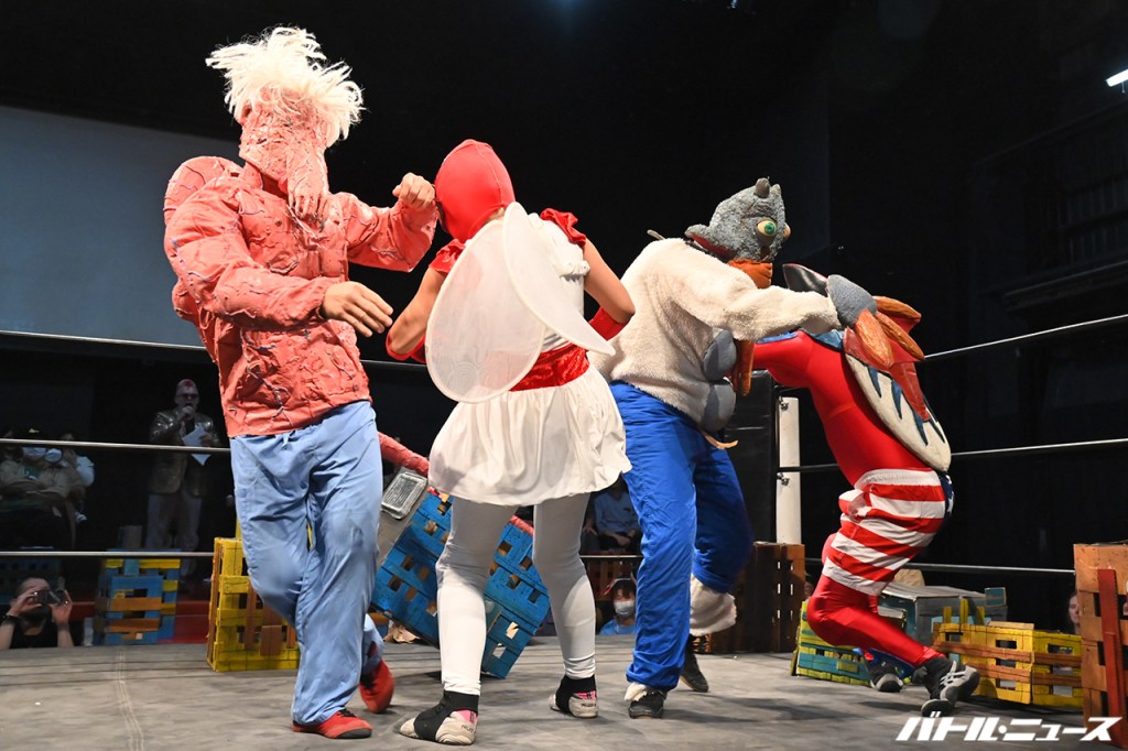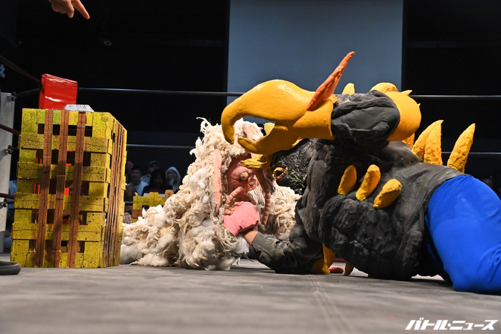 As Cycloptopus knocked down a building, Potato delivered a dropkick to him, sending him flying into the corner, and the referee entered the ring to begin the match.