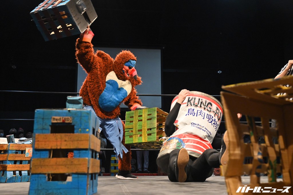 The minions set Kung Fu in the center of the ring, and when Tukor climbs up to the corner, Sky Deviler comes to his aid and throws the minions away one by one. Sky Deviler withstands Tukor’s double chop and delivers an uppercut with both knuckles. He then slams him down with a shoulder throw, but the revived minions push Sky Deviler into the corner. However, Sky Deviler threw his minion away and slammed it into Tukor, who caught the minion and knocked him down with a lariat.