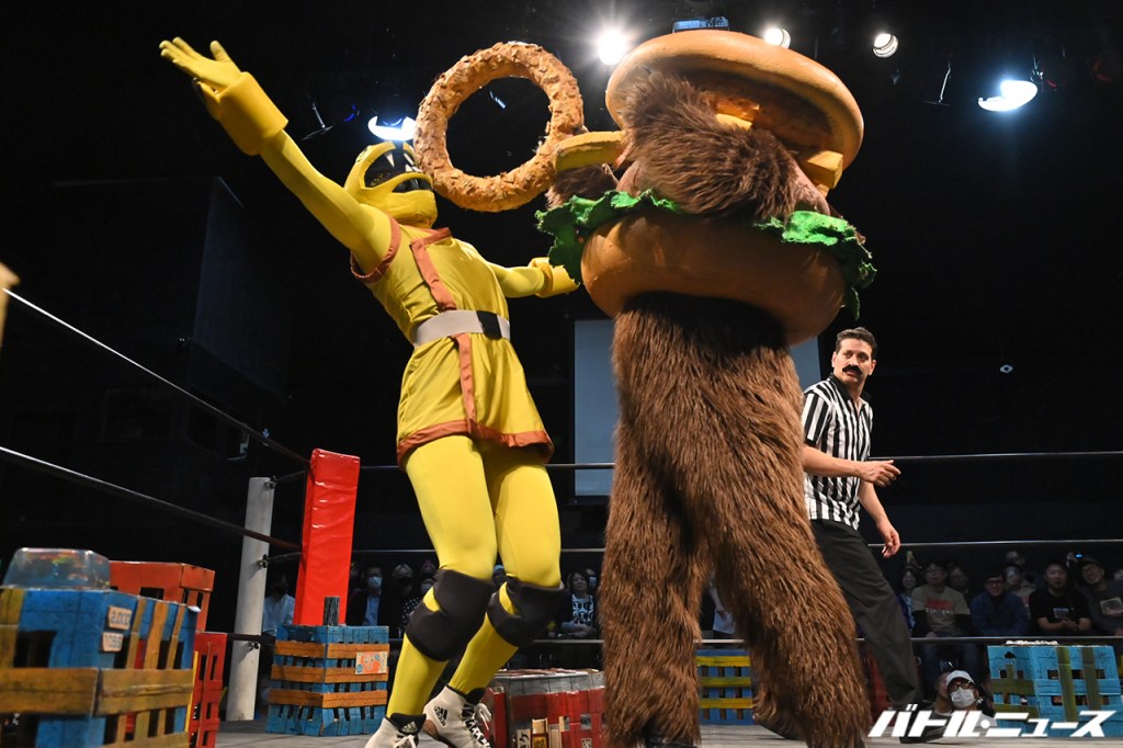 Ranger takes the onion ring and swings full force at the patty. He knocks the staggering Burger away with a tackle and gets a first fall.