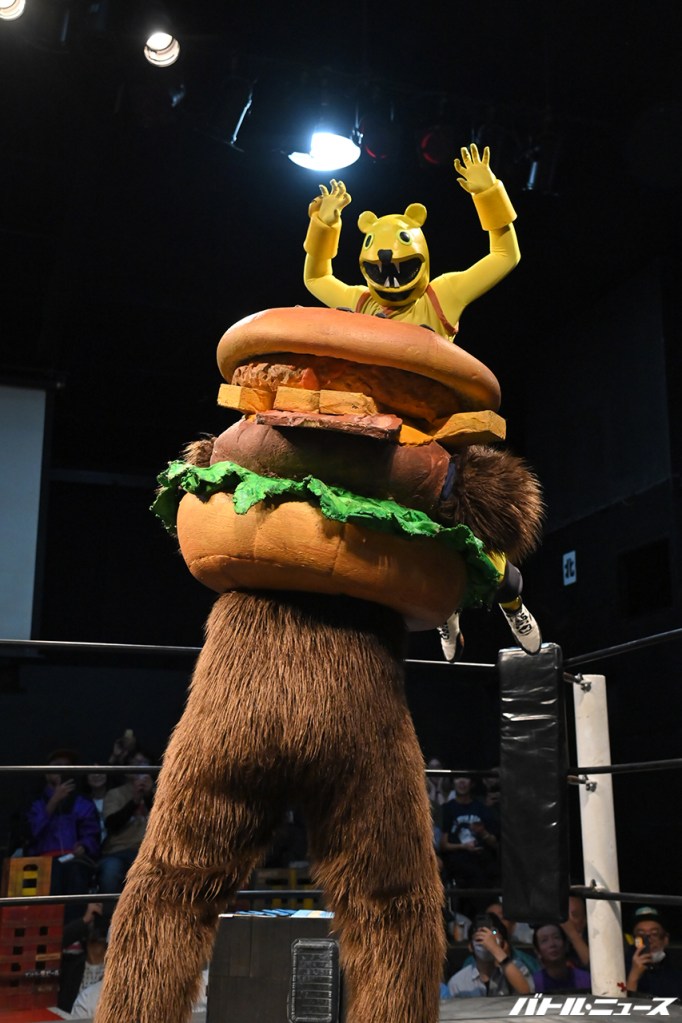 Burger runs in, but Ranger dodges and slams him into the corner, then bites into the bun with a skewering knuckle, and when he lets go, he hits a skewering gut shot and a series of gut shots. He then tries to swing Burger into the corner with a scratch attack, but Burger swings him back and crushes him with a series of skewering body splashes. However, Ranger avoids the third hit and knocks him down with a diving scratch attack, and the fall is also two.