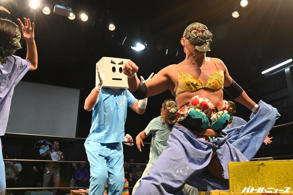 Party brings out a mysterious help coupon and tries to invite an old lady in the audience to the ring as a partner. But this is a feint. One of his minions tears off his T-shirt and mask, and Lingerie Muto appears from inside.