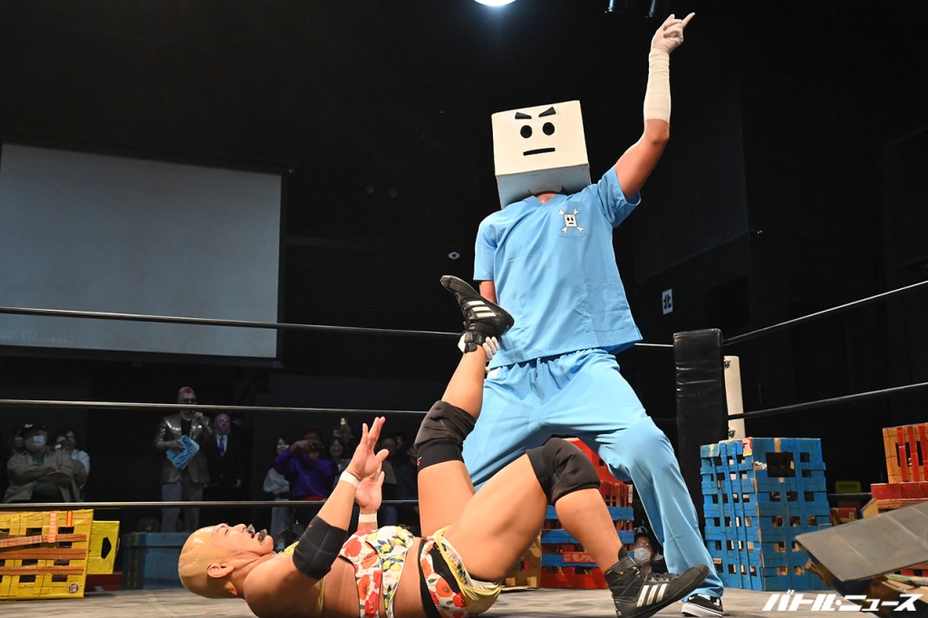 Muto chops his minions one after another, chops Hell Monkey, and then a low drop kick to Cube. He goes for the Shining Wizard from the Pro Wrestling LOVE pose, but Glass’s knee is damaged and he can’t run.