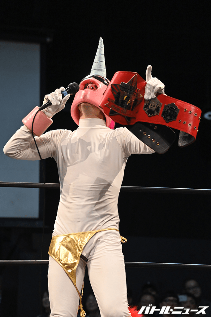 Dr. Cube had his minion carry the Kaiju Grand Champion belt and entered the ring with Hell Monkey. The Unicorn Party entered the ring with a treasure chest, and it seemed that they had found a treasure hidden in Shinkiba 1st RING.