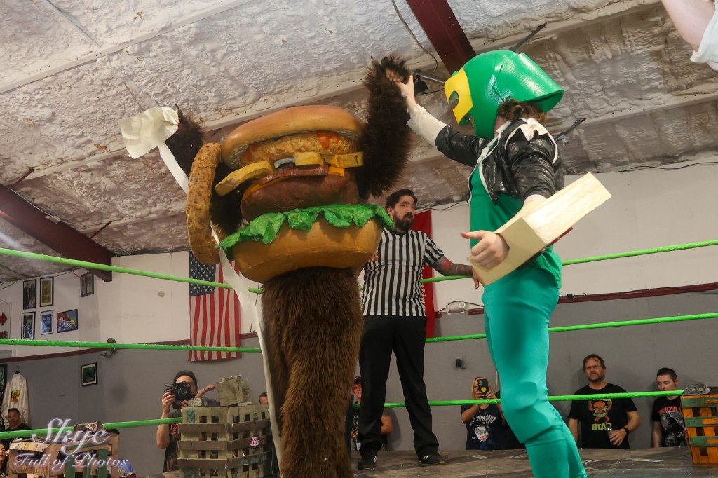Burger Bear puts the deed to the Monster Factory on the line for a chance at the Kaiju Grand Championship, and even steals the physical belt and brings it to the ring to piss Bear Ranger off.