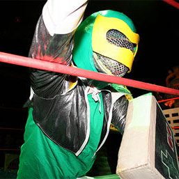 Under the tutelage of Kaiju greats American Beetle, Los Plantanos and Neo Teppen, the Intern was given a “Heroic” helmet and some on the job training. Before he even figured out how to work the copier at Kaiju HQ, the Intern was called upon to extend Call-Me-Kevin’s losing streak at the Area 57 Big Battel. When he managed to make the pin in his debut Battel, he was awarded a pair of sweet green leg gauntlets and a round of Jello shots. After scoring another win at Someone Must Die! he was upgraded to “Hero-in-Training.” At this point, it looked like there was no limit to the Hero Intern’s winning ways, and a promotion to full-time Hero (with a parking pass, health, and dental!) seemed inevitable.