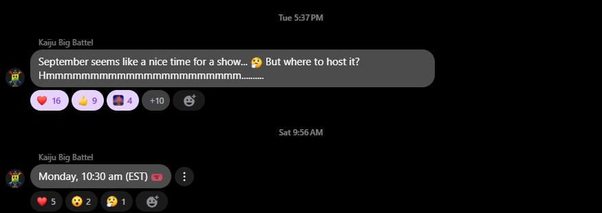 A message on the Kaiju Big Battel News Messenger page suggests that tickets for a yet unannounced September show will begin selling on Monday, July 21, at 10:30am EST.