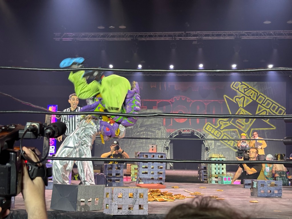 - Silver Potato rips Dr. Cube’s heart out to become the NEW Southern Division Champion in a three way match that included a sick Bear Ranger. (Fatality Fighto)