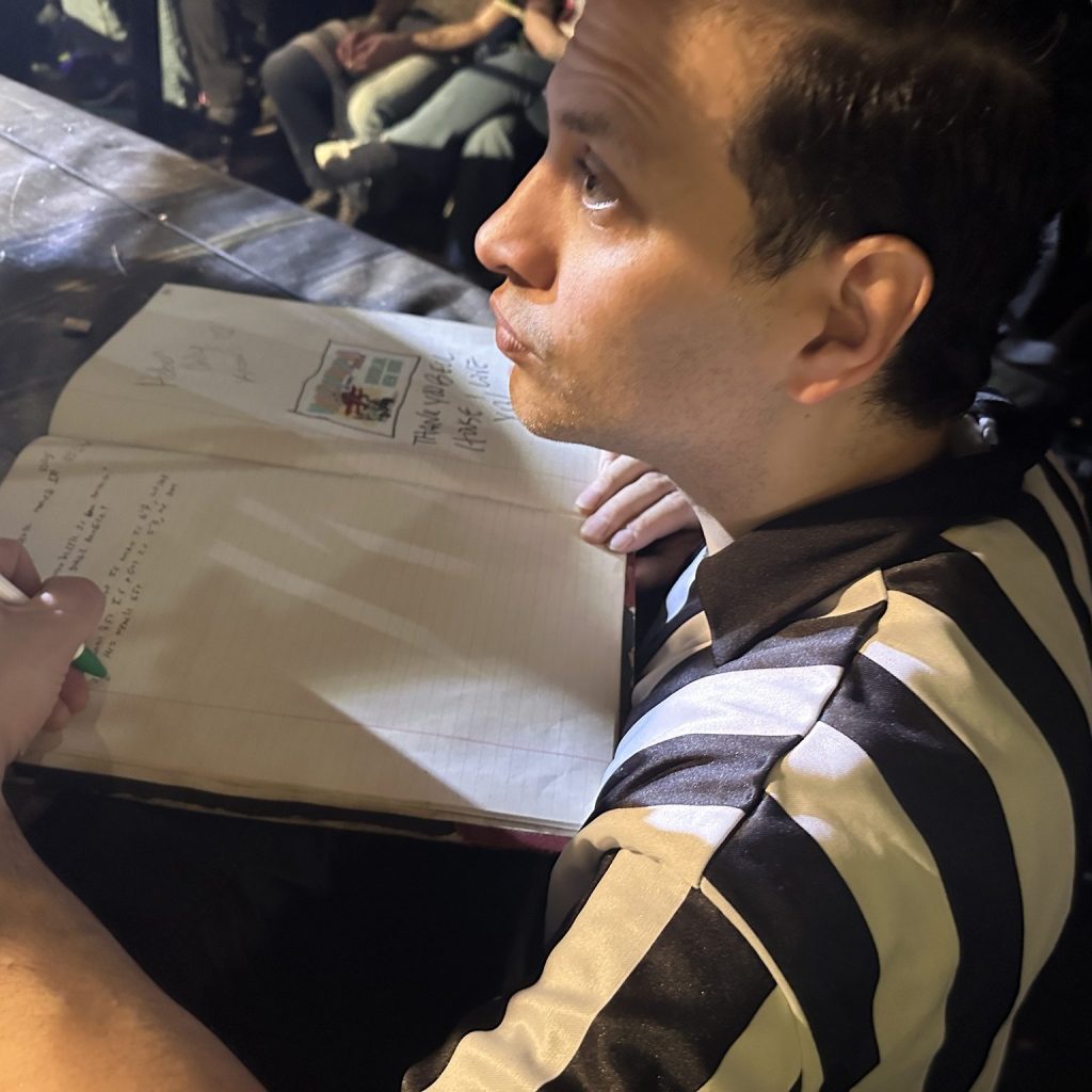 -He is seen in this image writing notes about Dundee’s referee techniques.