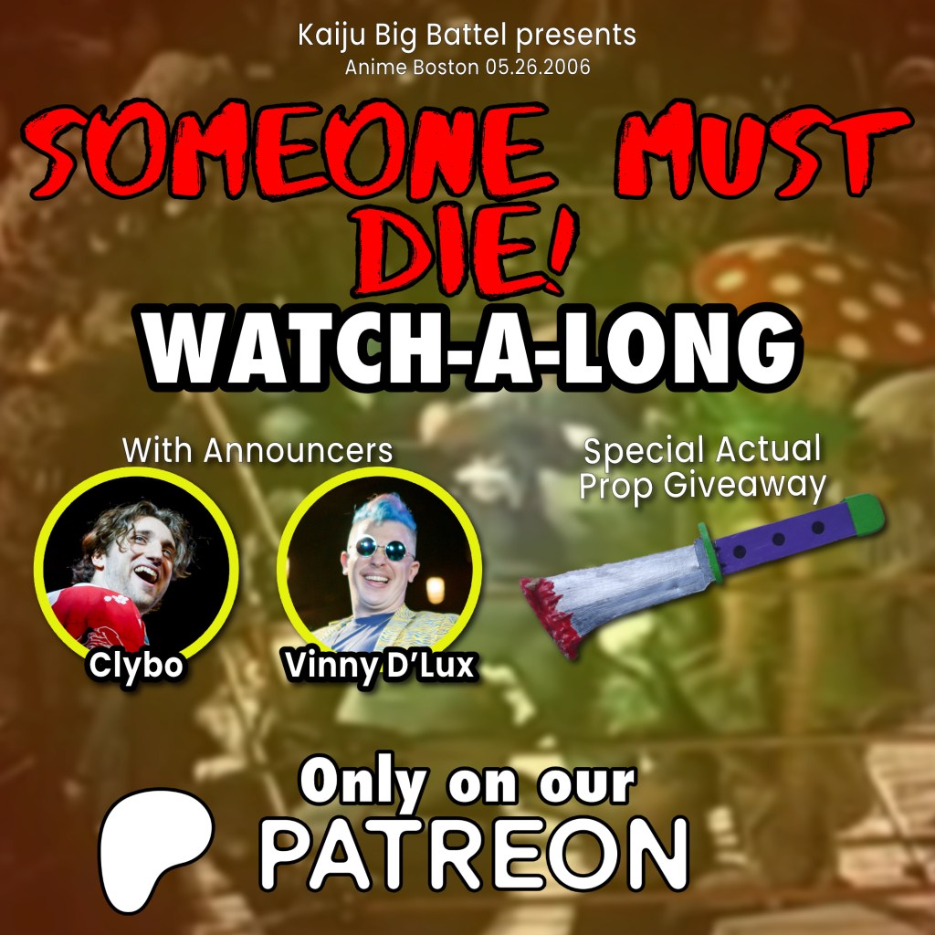 This Thursday, April 23rd at 8:00 PM, Kaiju Big Battel will hold its second Patreon-only livestream, and it’s gonna be an exciting one, as announcers Clybo and Vinny D’Lux hop into the discord chat to watch the Season 2 Classic SOMEONE MUST DIE with you!